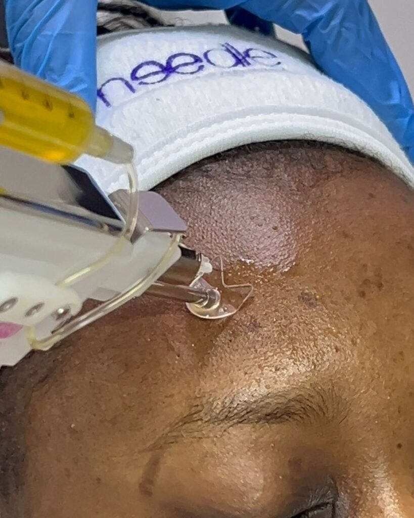 Using a fine needle or mesogun, tiny amounts of the cocktail are injected just below the skin’s surface in a grid-like pattern. The session takes 20–45 minutes. -